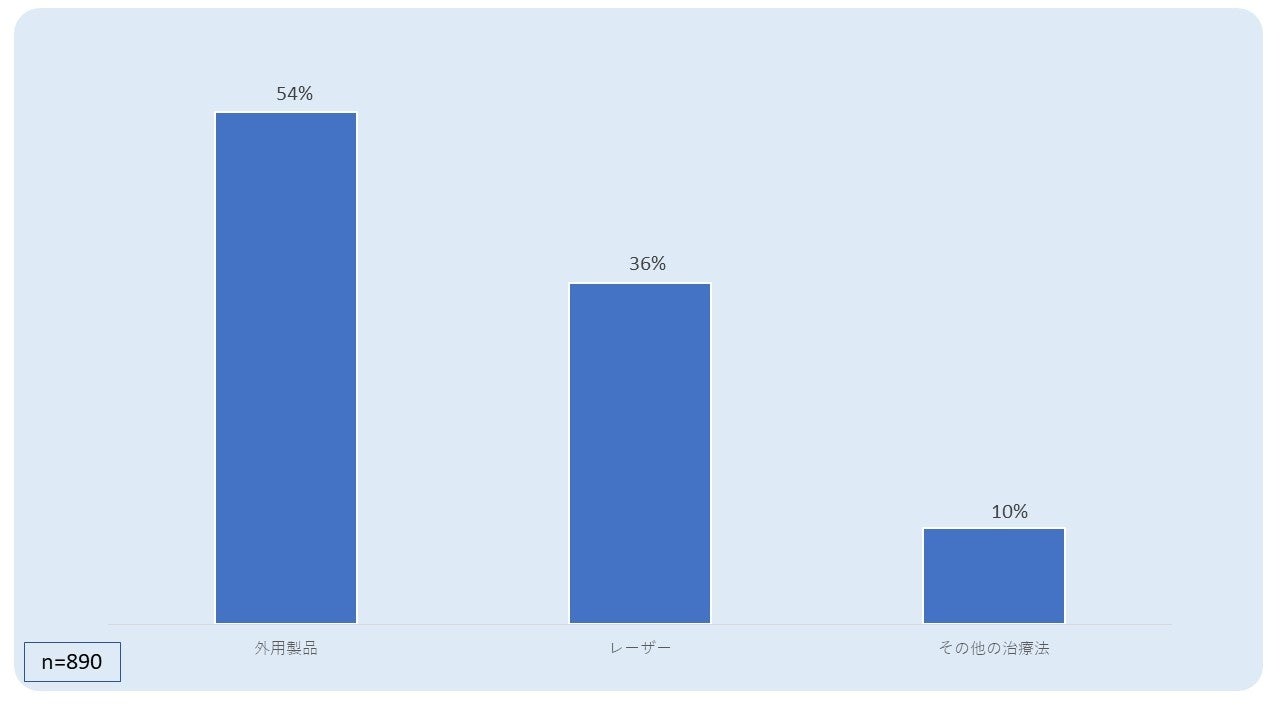 - 調査結果によると、回答者の大多数(53.9%)が、妊娠線に対して主に外用剤による治療を行っています。次いでレーザー治療が35.9%、その他の治療法は 10.1% を占めています。