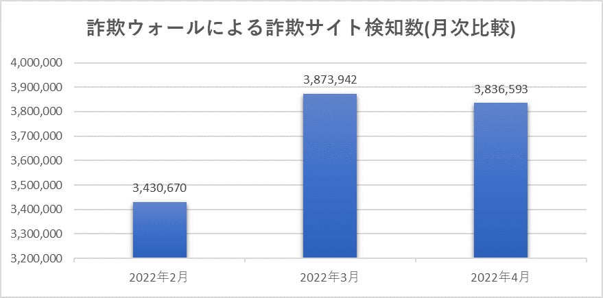 2022年4月の詐欺ウォールによる詐欺サイト検知数は3,836,593件で、2022年3月と比較すると、37,349件減少する結果となりました※。微々たる減少のため、交通系サービスをかたるフィッシング詐欺が増加したものと考えられます。