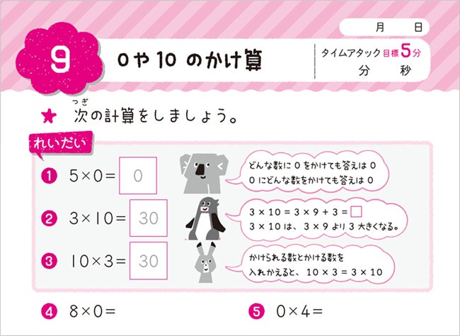 漢字も計算も1頁を目標5分の「タイムアタック」で解く練習をします。巻末の「学習の記録」には、正答数だけでなく、解くためにかかった時間を記入することで、実力がアップしたかどうかを一目で確認することができます。