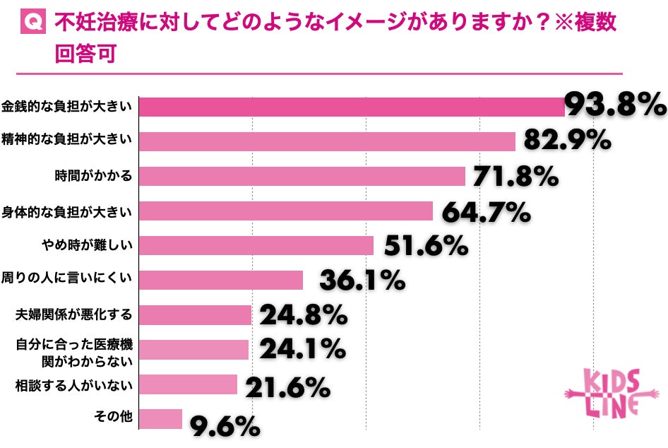 キッズライン会員でお子様がいらっしゃるご家庭に「不妊治療に対してどのようなイメージがありますか?」と質問したところ、「金銭的な負担が大きい」が93.8%、「精神的な負担が大きい」が82.9%、「時間がかかる」と回答した人が71.8%でした。