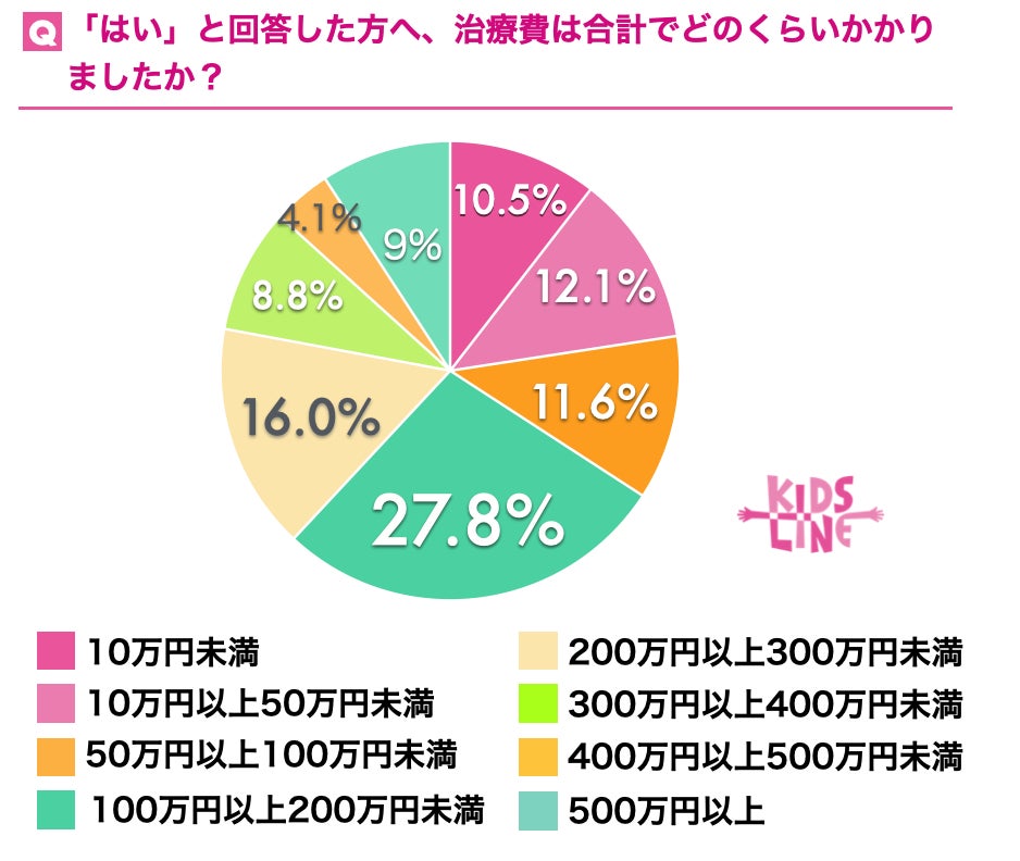 そこで「はい」と回答した人に「治療費は合計どのくらいかかりましたか?」と質問したところ、「100万円以上200万円未満」が27.8%、「200万以上300万未満」と回答した人が16%でした。また、「治療にどのくらいの期間かかりましたか?」と質問したところ、多い順に「1年以上2年未満」が29.1%、「1年未満」が28.6%、「2年以上3年未満」と回答した人が21.2%という結果となりました。