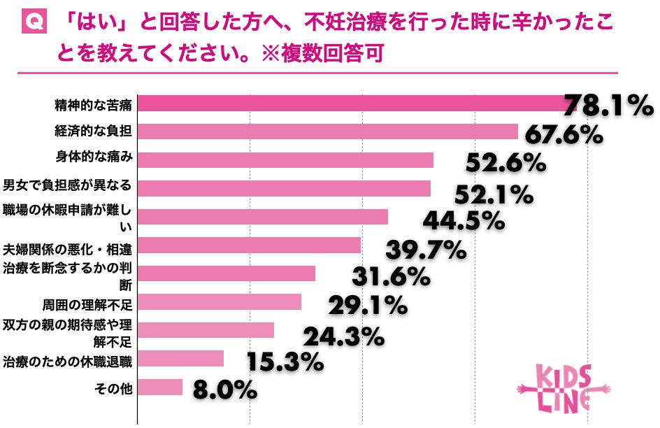 さらに、不妊治療の経験があると回答した人に「不妊治療を行った時に辛かったことを教えてください」と質問したところ、「妊娠しなかった時の精神的な苦痛」が78.1%、「金銭的な負担」が67.6%、「身体的な負担」が52.6%、「男女で負担感が異なる」と回答した人が52.1%でした。