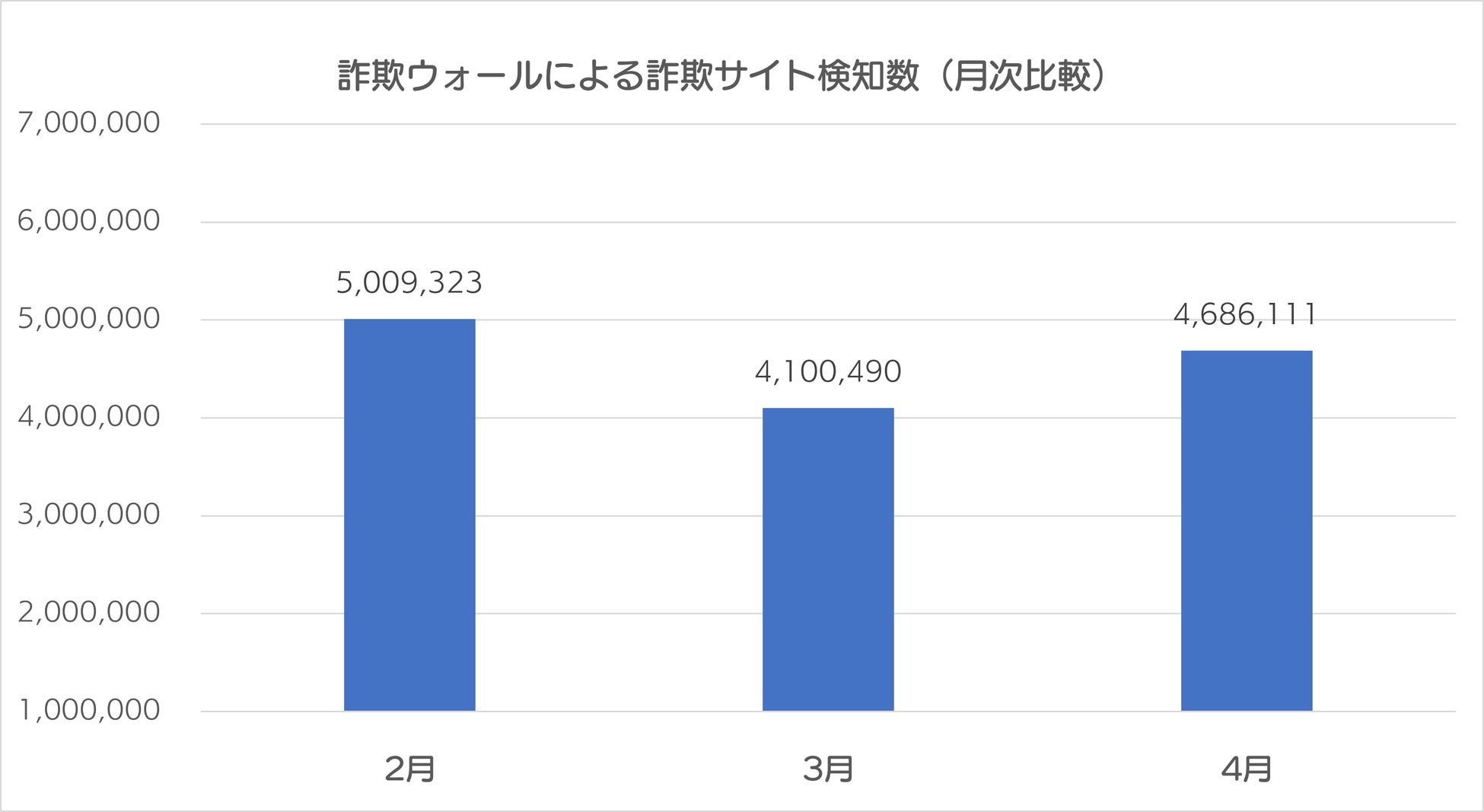 2024年4月の詐欺ウォールによる詐欺サイト検知数は4,686,111件で、2024年3月と比較すると、585,621件増加する結果となりました※。