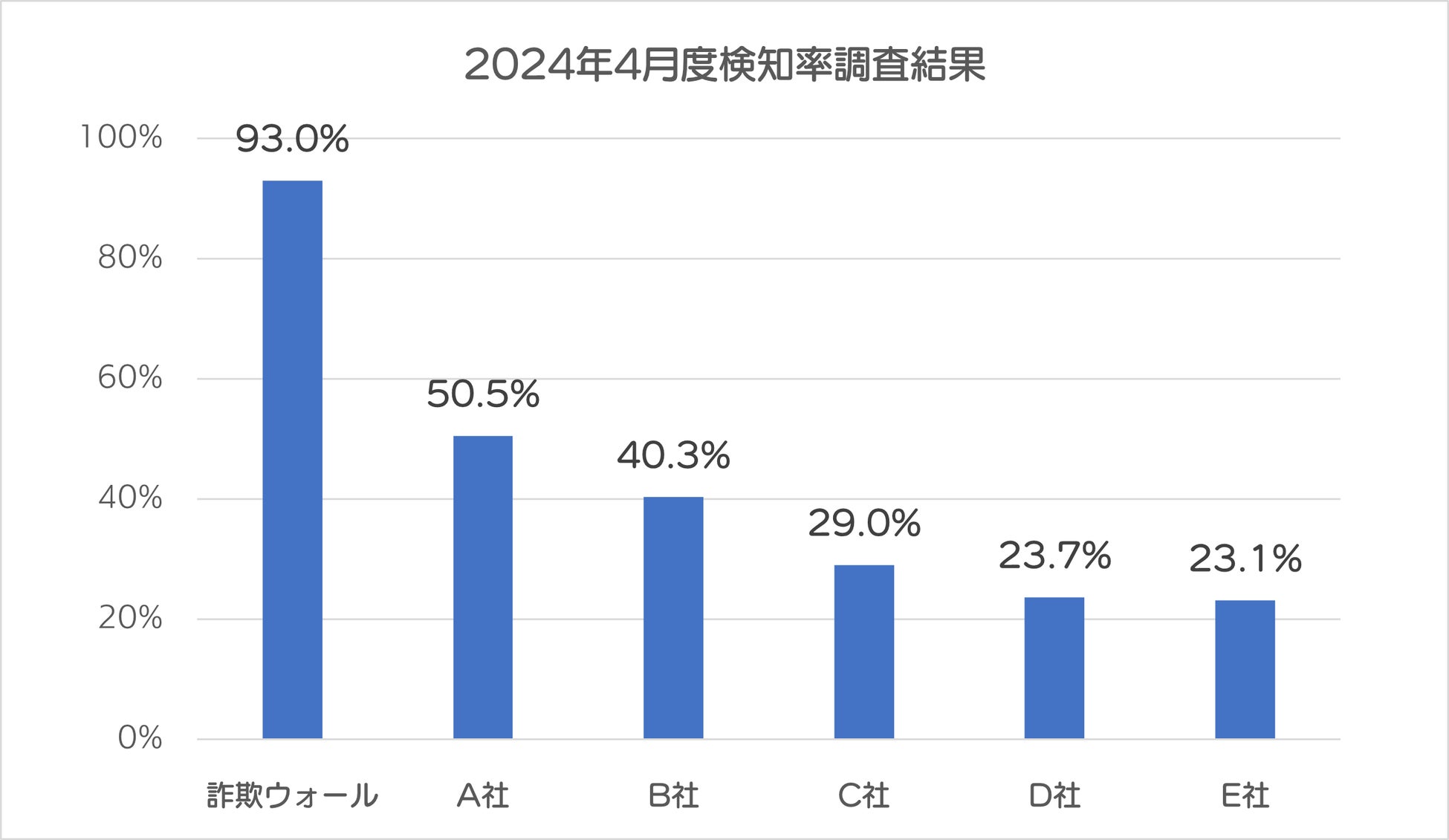 詐欺ウォールを開発・提供するBBソフトサービスでは、公的機関などとの連携によって収集した詐欺サイトURLを利用し、定期的に詐欺サイトの検知率調査を行っています。2024年4月の詐欺ウォールによる詐欺サイト検知率は93.0%と他社と比較し高い結果となりました。