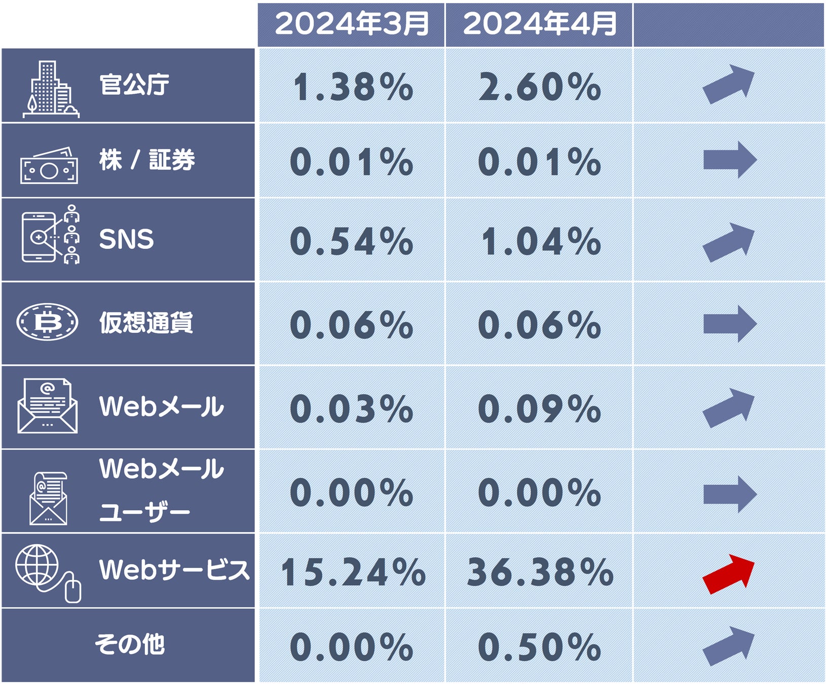 4月度はWebサービスカテゴリの構成比が上昇しています。TEPCO増加に伴い構成比が上昇しています。銀行は9ポイント減少していますが、三菱UFJ銀行の報告数が減少したことが起因しています。ですが高止まりの傾向があるため注意が必要です。携帯キャリアはSoftBankの報告数が減ったことにより構成比が減少しています。