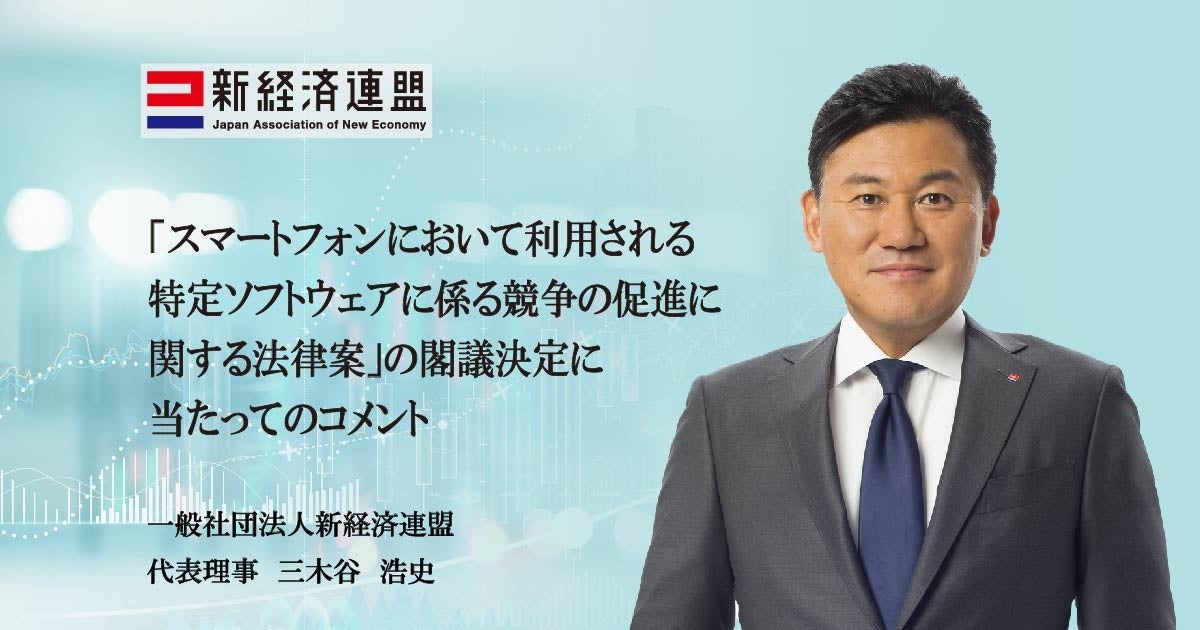 一般社団法人新経済連盟(所在地:東京都港区、代表理事:三木谷浩史、以下「新経連」)は、「スマートフォンにおいて利用される特定ソフトウェアに係る競争の促進に関する法律案」の4月26日付閣議決定を受けて、代表理事のコメントを発表します。