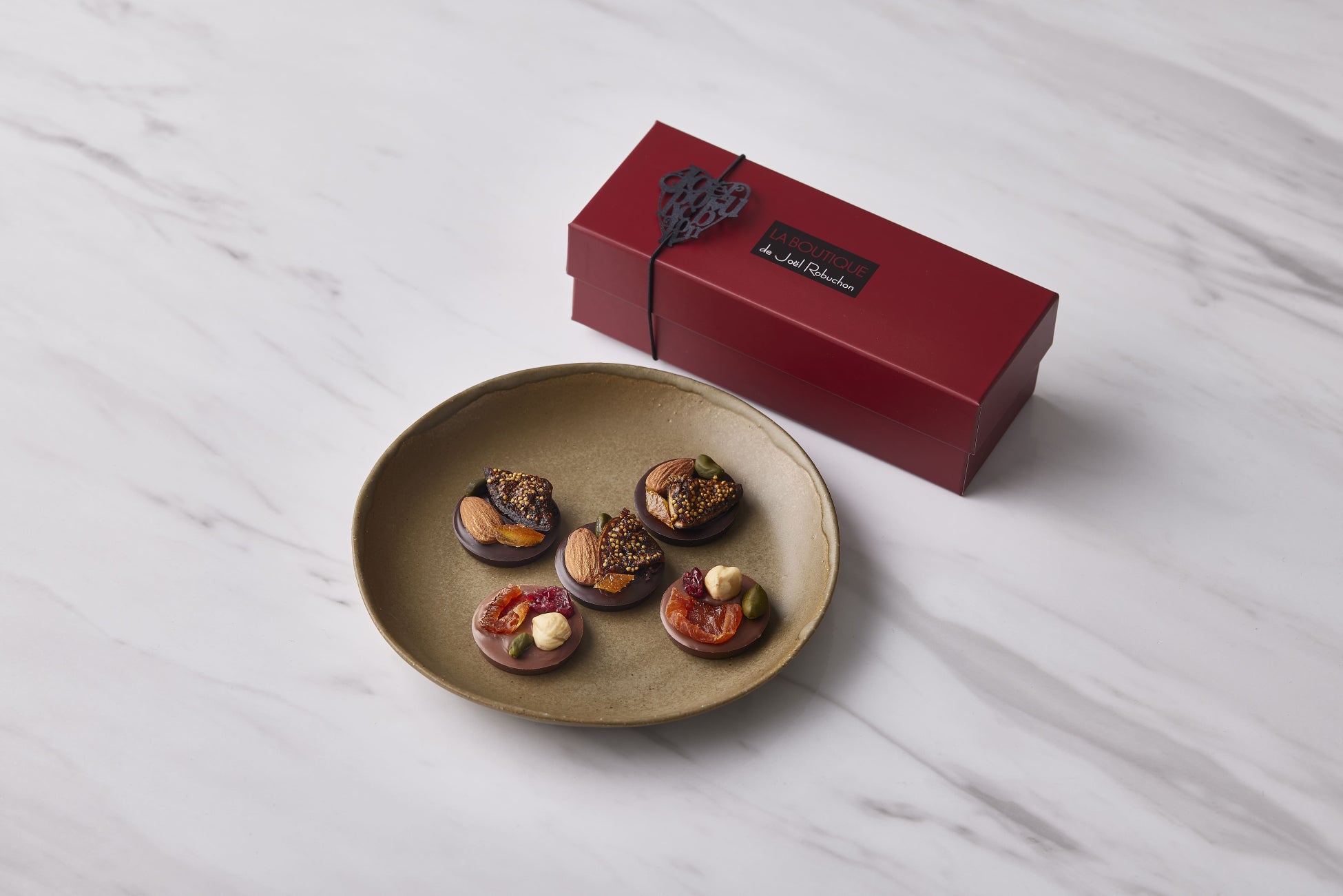 コクのある味わいのミルクとビター、2種のチョコレートそれぞれに相性のよいナッツとドライフルーツをのせたフランス伝統のチョコレート菓子「マンディアン」のアソート。深紅のボックスに詰め合わせたひと口サイズのマンディアンはギフトや手土産にぴったりです。