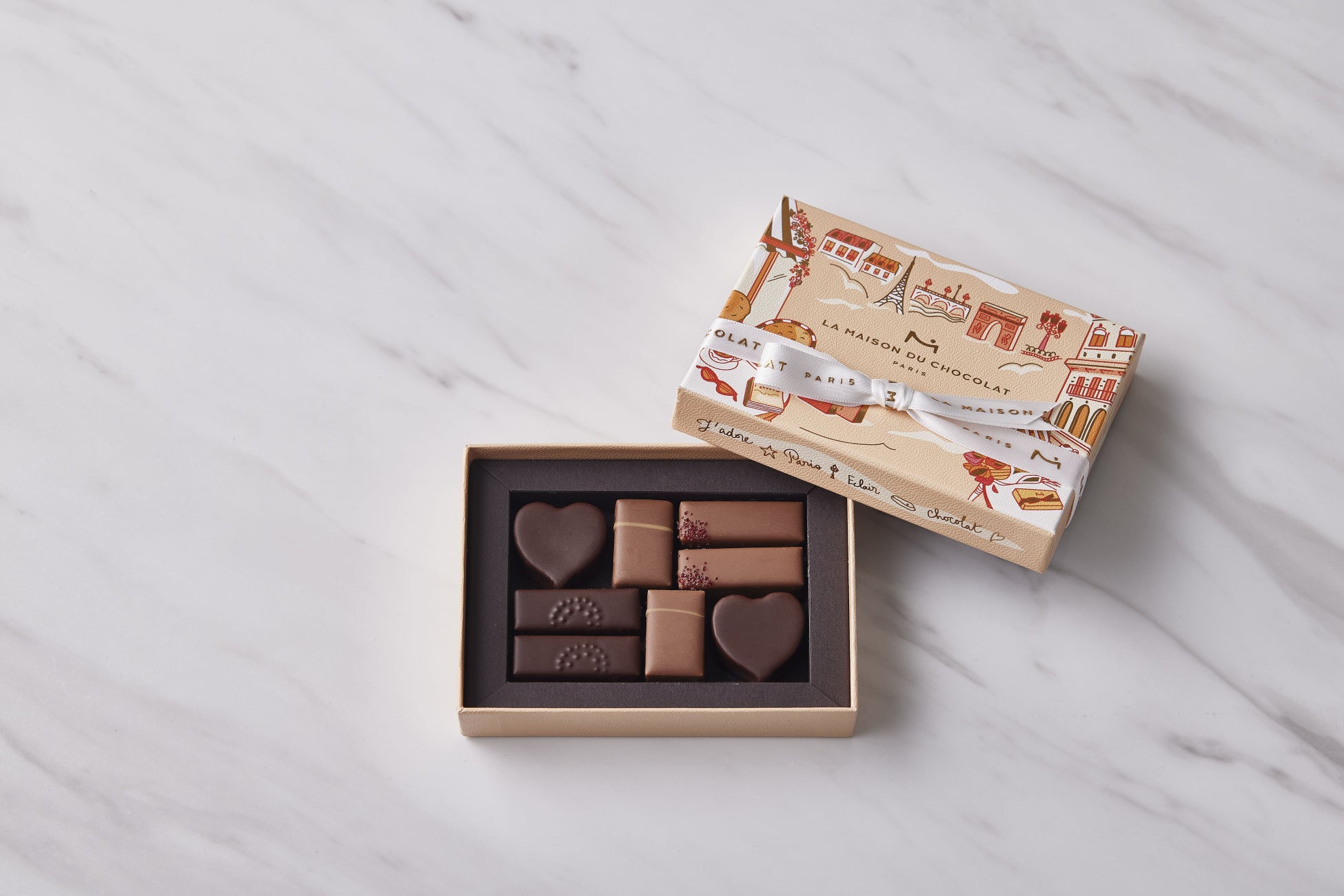メゾンを象徴するパリの地を表現した、2024年バレンタインの限定コフレ。マダガスカル島産カカオ74%のダークガナッシュやイチゴのピューレを用いたダークガナッシュ、カシューナッツのミルクプラリネなど、限定ショコラ4種の詰め合わせです。