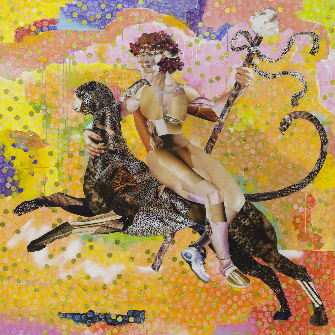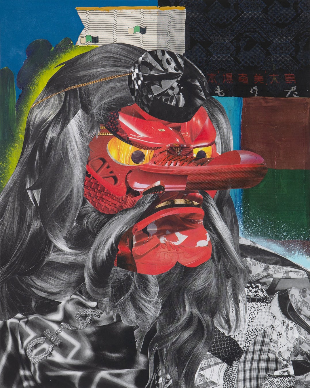 民族衣装を身にまとうアフリカの部族や日本の獅子舞といった土着的なモチーフ。目を凝らして見ると、絵を形成しているのは高級メゾンのモノグラムやファッション雑誌の切り抜き記事、そしてマーカーで手描きされたドット模様など。見知らぬ世界の習俗や儀礼を現代的なイメージで浮かび上がらせるコラージュ作品。