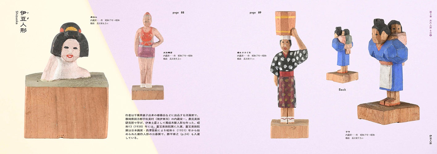 本書では、このわずか15年の間に全国各地で作られた木片(こっぱ)人形・木彫風俗人形を中心に、様々な制作品をその成り立ちとともに紹介しています。また、運動全体を俯瞰する解説や、同時期に作られるようになった北海道・八雲町の熊彫との関係、現在長野で作られている作品紹介など、農民美術に初めてふれる人に向けて様々な内容を収録した入門書です。
