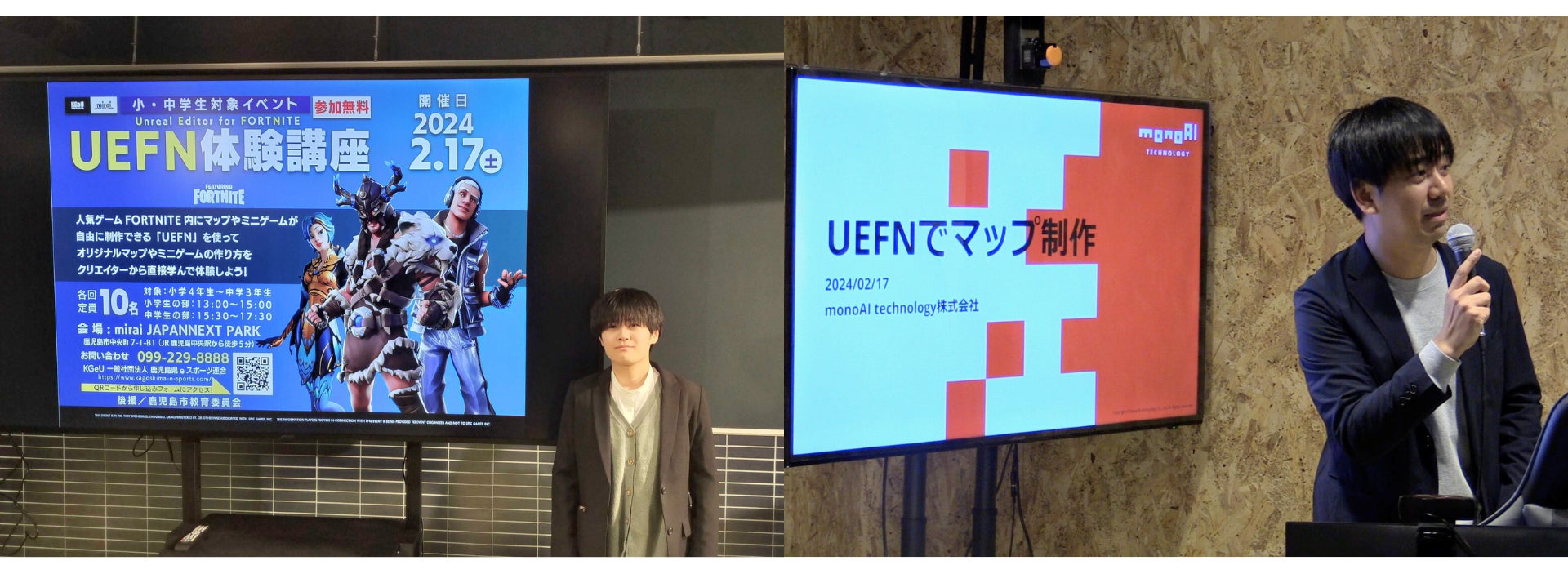 monoAI technology株式会社(本社:兵庫県神戸市、代表取締役社長:本城嘉太郎、東証グロース市場:証券コード5240、以下「当社」)は、2024年2月17日(土)に、鹿児島県のeスポーツ総合施設「mirai JAPANNEXTPARK」にて開催された「UEFN体験講座」の講師として、小・中学生向けにフォートナイトのクリエイティブマップ制作ワークショップを行いました。