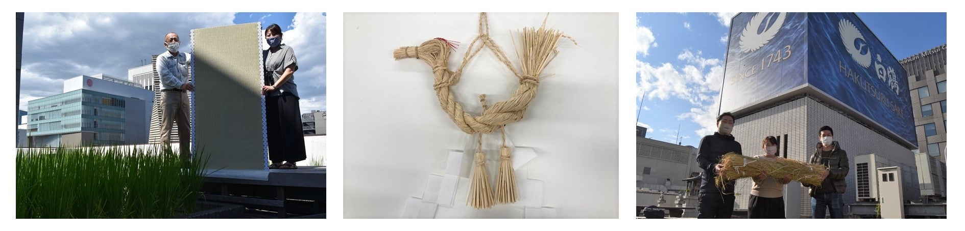 「白鶴銀座天空農園」で収穫した独自開発米「白鶴錦」を岡田畳本店(埼玉県川越市)さまに畳にしていただきました。畳の芯になる素材(畳床)に稲藁が使われています。最近では畳床に木材ボードや発泡スチロールを使用したものが多いそうで、稲藁を使った畳は高級品だそうです。