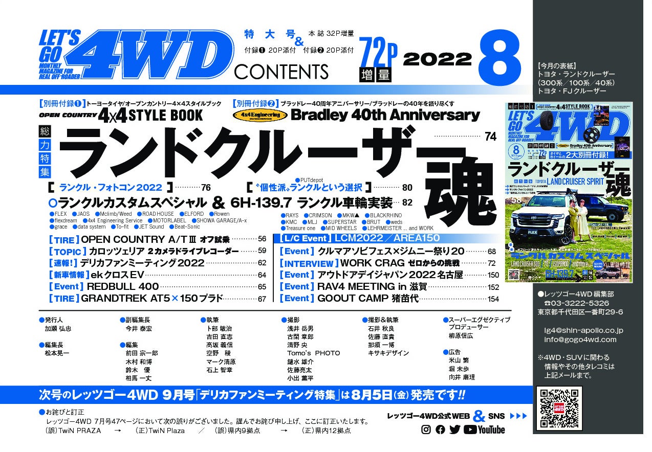 オフロード派もキャンパーも楽しめる本格四駆【ランドクルーザー】特集!! レッツゴー4WD 8月号は2022年7月6日(水)発売!