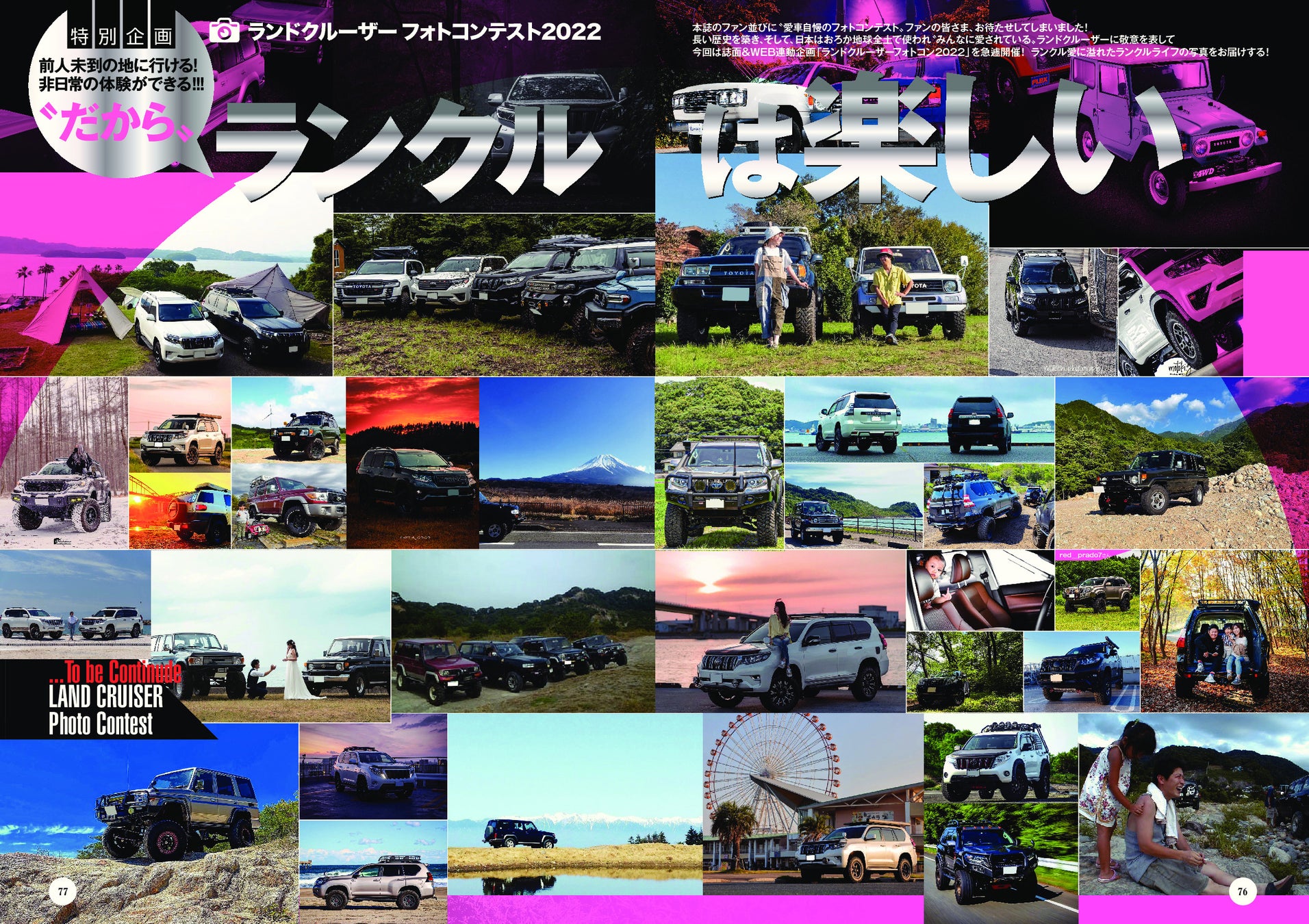 長い歴史を築き、日本はおろか地球全土で使われ“みんなに愛されている”ランドクルーザーに敬意を表して、今回は誌面&WEB連動企画「ランドクルーザーフォトコン2022」を急遽開催! ランクル愛に溢れたお写真をお届けします!