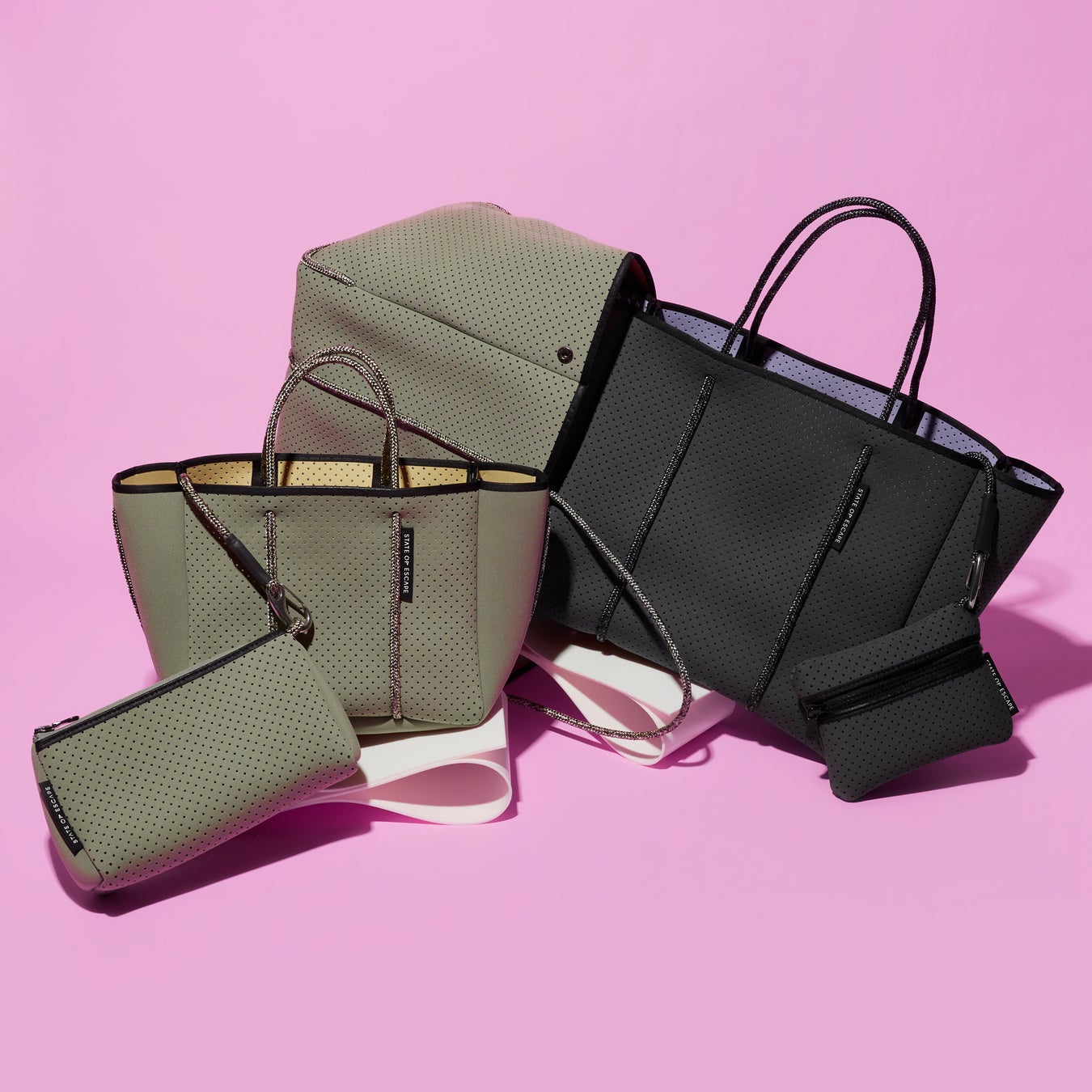 防水・防汚加工がほどこされた、軽くて丈夫なネオプレン素材のトートバッグでお馴染みのオーストラリア発<ステート オブ エスケープ>。春夏シーズンに続くバーニーズ ニューヨーク創業100周年記念の限定アイテムとして、外側と内側で異なるカラーを組み合わせた“DUAL(デュアル)”コレクションの特別な配色が登場いたします。 “CARRYALL(キャリーオール)”・“PETITE ESCAPE(プティエスケープ)”・“FLYING SOLO(フライングソロ)”の3アイテムを、2パターンの配色でご用意。ワントーンのバッグとは一味違うスペシャルな雰囲気をお楽しみください。