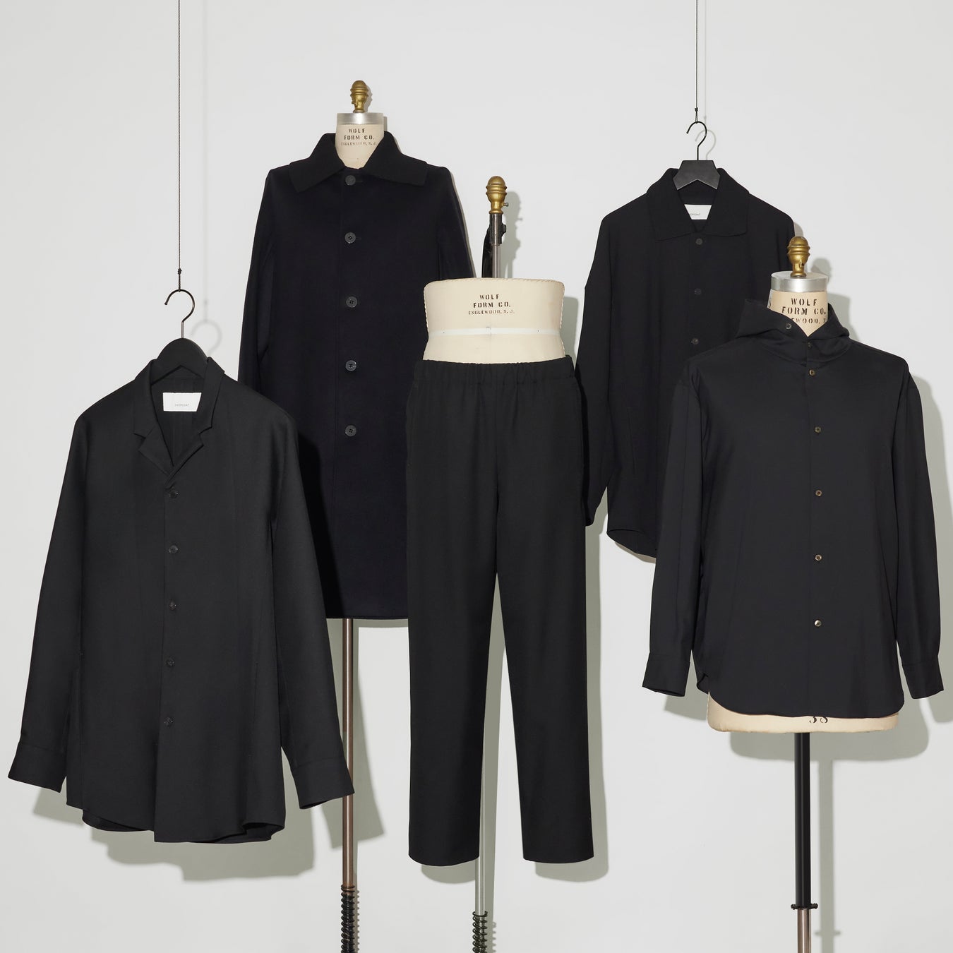 (左から)シャツジャケット ¥93,500・コート ¥191,400・ワイドパンツ¥68,200・リブカラーシャツジャケット ¥95,700・フーデッドシャツ ¥53,900(すべて税込)