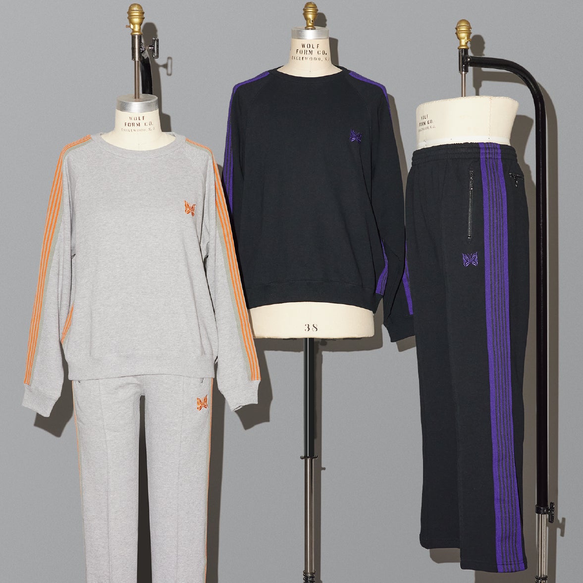 シルエットの美しさに定評のある<ニードルズ>のトラックウェアは、海外アーティストが着用したことから人気に火がつき、今では世界中のファッショニスタが愛用していることでも有名です。今回は、バーニーズ ニューヨーク創業100周年を記念した限定アイテムとして、セットアップで着用可能なクルーネックプルオーバーとトラックパンツを、スエット素材の限定カラーでウィメンズ・メンズともにご用意しました。ブラックにはパープルのライン、グレーにはオレンジのラインがそれぞれ入り、セットアップでも着用可能なので、スタイリングの幅も広がること必至です。