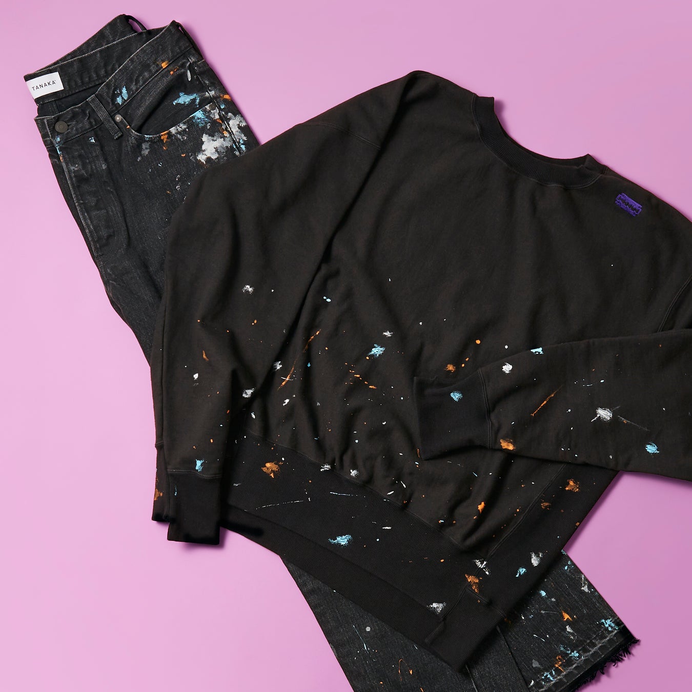 デザインとサスティナビリティを追求し、“これまでの100年とこれからの100年を紡ぐ服”をコンセプトに掲げる<タナカ>には、得意のクラフトワークを駆使し、一点ずつ職人が手作業でペイントをほどこしたスエットシャツとデニムパンツを限定アイテムとしてオーダーしました。ポケット付近の作業跡やひざ下から裾にかけて飛んだペンキなど、ストーリー性を感じる加工感に唯一無二のこだわりが詰まっています。
