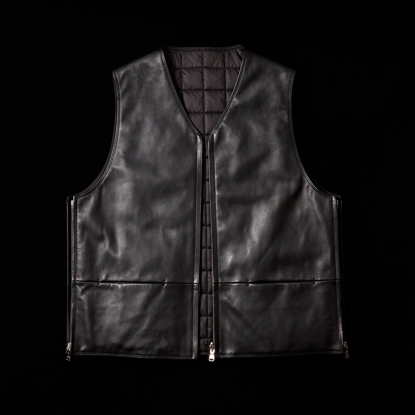 スタンダードなアイテムにコンテンポラリーな要素を加えたユニセックスなウェアを展開する<ヨーク>には、トレンド感のあるベストをブランドでも定評のあるレザーでオーダー。<ヨーク>らしいハードな質感のシープレザーを表面に、裏側には中綿入りのキルト素材を用い、リバーシブル仕様にすることで、保温性だけでなく着まわししやすい一着に仕上げました。軽い羽織りやレイヤリングアイテムとして、これからの季節のコーディネートを格上げするアイテムとしておすすめです。