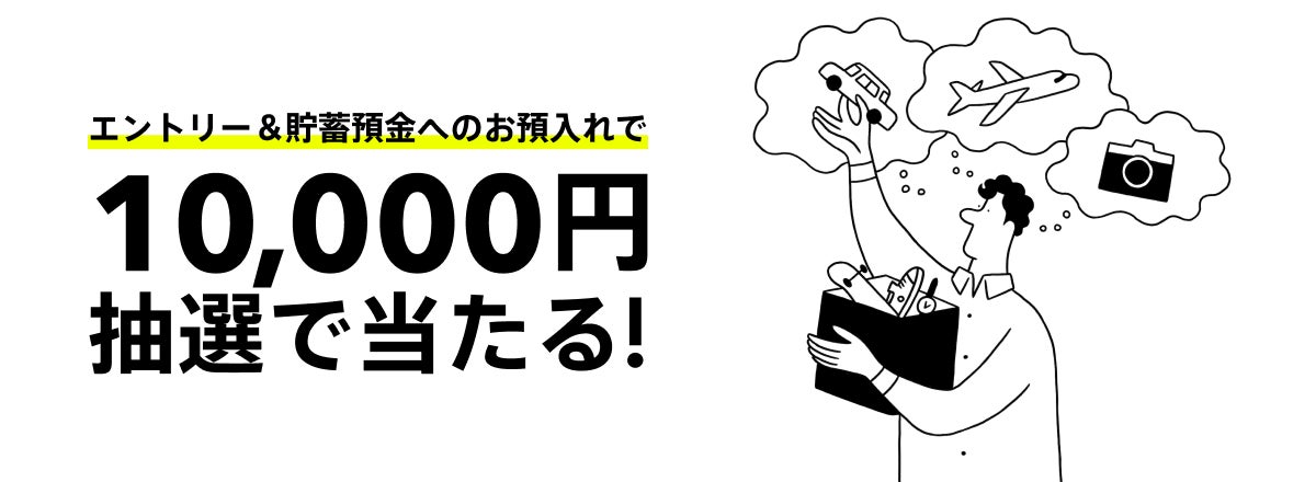 キャンペーン期間中に、みんなの銀行貯蓄預金口座残高(Box、Savingの合計残高)を10万円以上増やしていただいたお客さまを対象に、抽選で現金1万円を100名さまにプレゼントします。