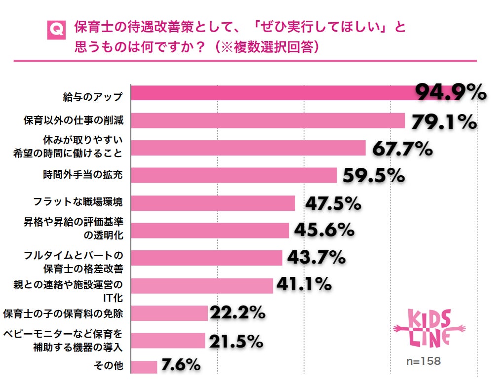 保育士の94.9%、9割以上の方があげたのは「給与のアップ」でした。
