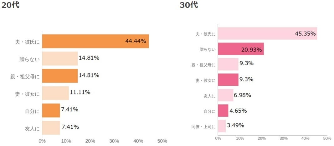 年代別に見ると20代30代の世代では夫・彼氏が45%前後を占めているい一方、自分へとの回答は1割にも達していません。40代50代では夫・彼氏に贈るというひとは30%前後で若い世代と10%以上もの開きが出ました。