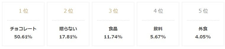 チョコレートが半数を占めました。“贈らない”という人もいるものの、5位以内にはチョコ以外の食品・飲料・外食、と全て“食”に関するものがランクインしています。