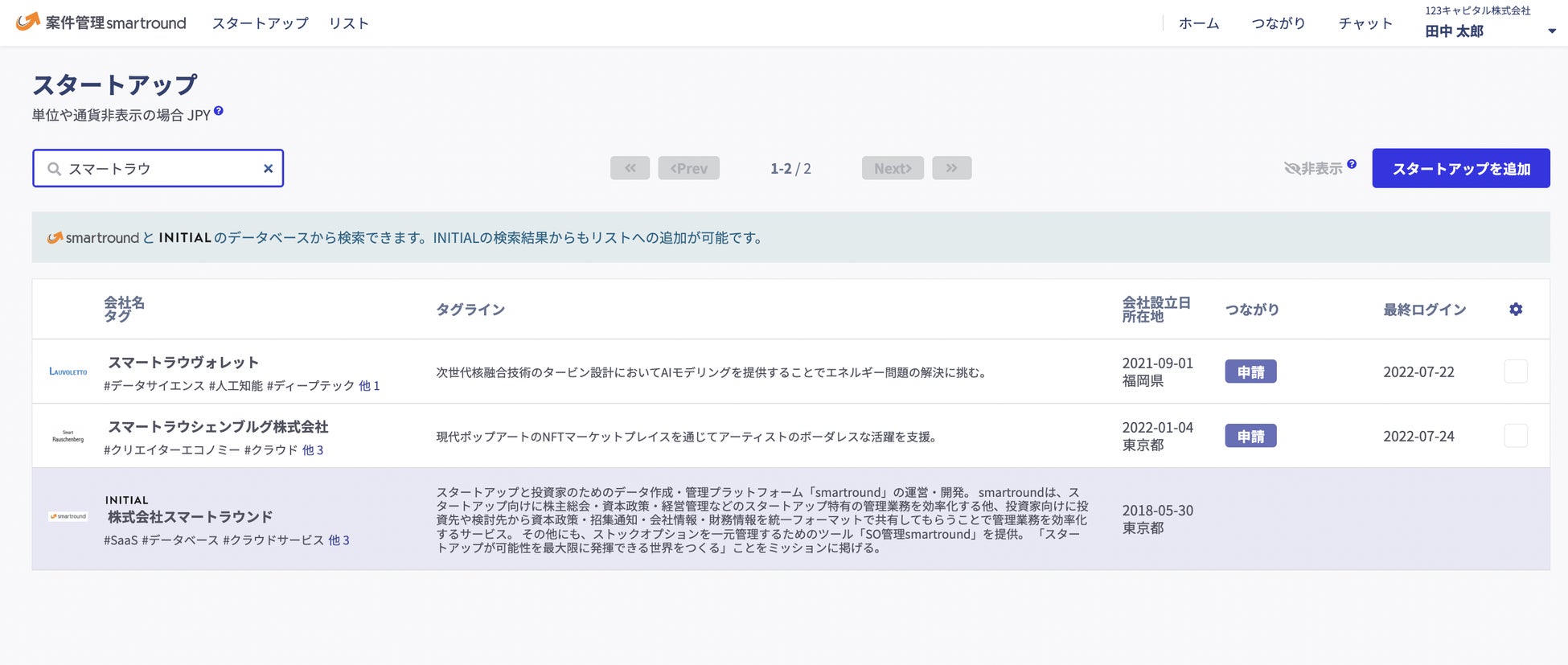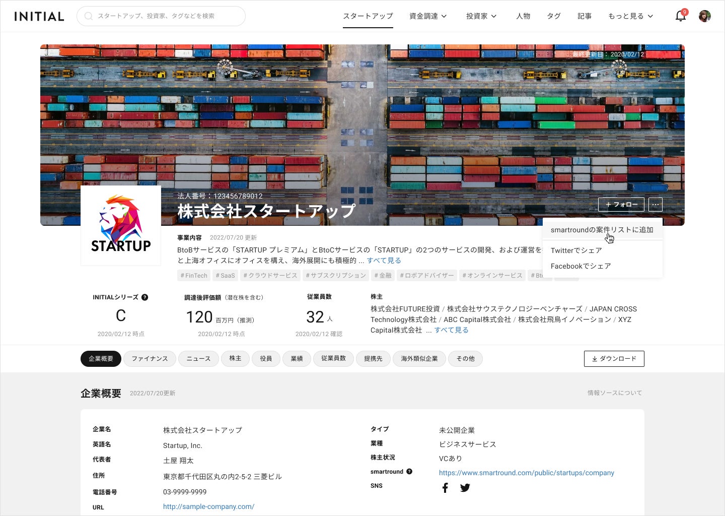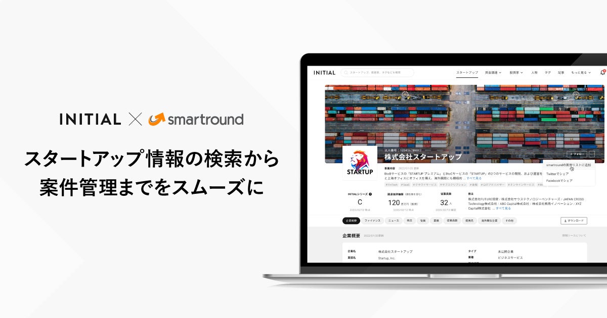 株式会社ユーザベースが提供するスタートアップ情報プラットフォーム「INITIAL」は、スタートアップと投資家のためのデータ作成・管理プラットフォーム「smartround」を運営する株式会社スマートラウンドと業務提携契約を締結いたしました。本契約に基づき2022年7月26日(火)より新たに、INITIAL上で検索したスタートアップ情報をsmartroundの「案件管理リスト」および「投資管理リスト」に追加できるようになります。