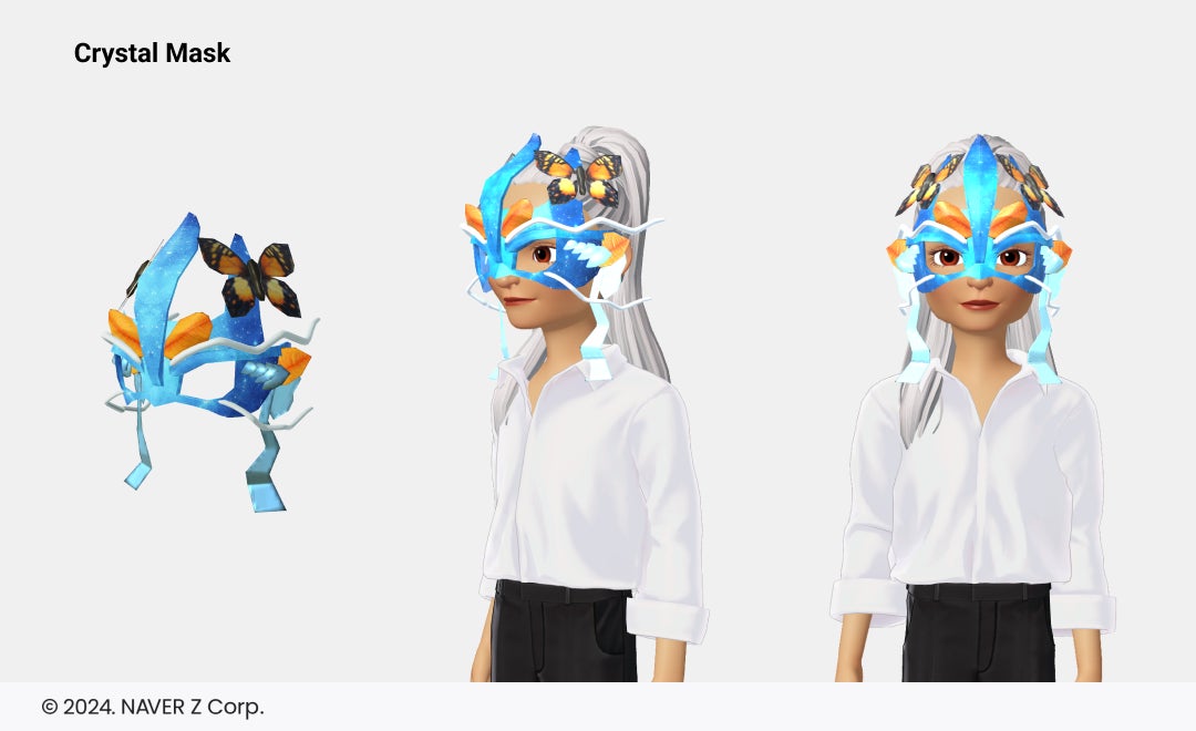 今回、新たにアバターベースのソーシャルプラットフォーム「ZEPETO(ゼペット)」で販売開始となったのは、“バーチャル仮面舞踏会のハイファッションマスク”をテーマにしたマスクです。このアイテムは、顔を覆うユニークな形状と、サイドを飾る印象的な蝶のデザインが特徴となっています。