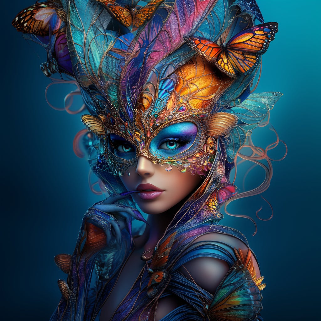 この仮面は、メタバースの「バーチャル仮面舞踏会」をテーマにしたアイテムです。深い青色を基調にし、星空のような模様が神秘的な雰囲気を醸し出しています。また、オレンジと黒の蝶がアクセントとなり、華やかさと生命感を加えているだけでなく、蝶の立体感がデザインを際立たせ、仮想空間での華やかな場にぴったりのアイテムとなっています。