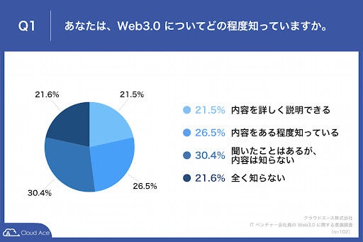 「Q1.あなたは、Web3.0 についてどの程度知っていますか。」(n=102)と質問したところ、「内容を詳しく説明できる」が 21.5%、「内容をある程度知っている」が 26.5% という回答となりました。