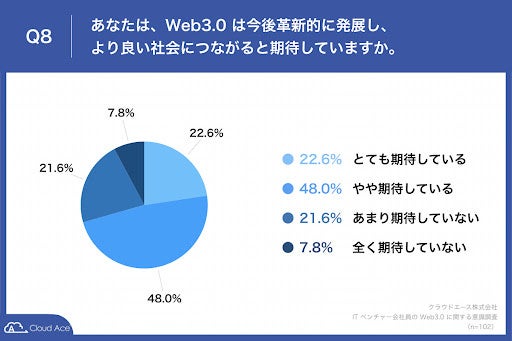 「Q8.あなたは、Web3.0 は今後革新的に発展し、より良い社会につながると期待していますか。」(n=102)と質問したところ、「とても期待している」が 22.6%、「やや期待している」が 48.0% という回答となりました。