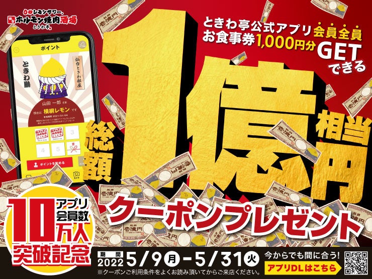 この度、2020年9月のときわ亭公式アプリリリースから約1年半で、アプリ会員が10万人を達成いたしました。これを記念して、5月9日(月)から5月31日(火)の期間限定で、感謝を込めて『アプリ会員10万人突破感謝キャンペーン』を渋谷店など全国47店舗にて開催します。5月8日(日)の店舗営業終了時点で公式アプリをダウンロードしてご登録いただいているアプリ会員全員に、総額一億円となる、100円×10回分のクーポンをアプリより配布いたします。