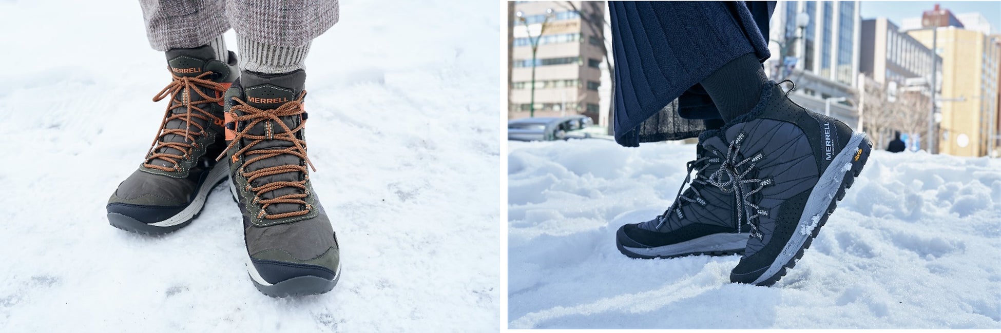 「NOVA SNRAKER BOOT WATERPROOF」、「ANTORA SNEAKER BOOT WATERPROOF」は、メレル独自開発の防水メンブレンを搭載し、足首までしっかりホールドするため、積雪環境でも常に足元をドライな状態に保ち、安心感のある歩行をサポートします。