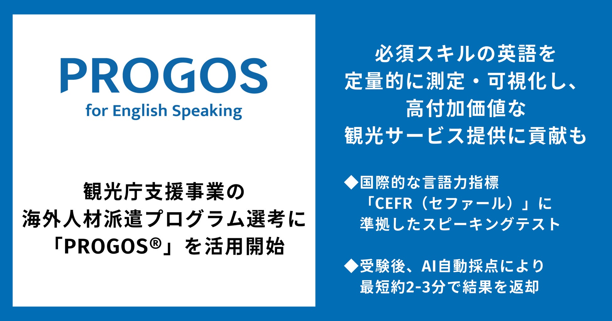 「PROGOS®」は、国際標準の指標であるCEFRに準拠したテストであり、AI自動採点による大規模受験も可能。今回の観光庁の支援事業における活用をはじめ、行政や企業を問わず【英語スピーキング力の測定・可視化】という用途において、幅広く活用いただけます。