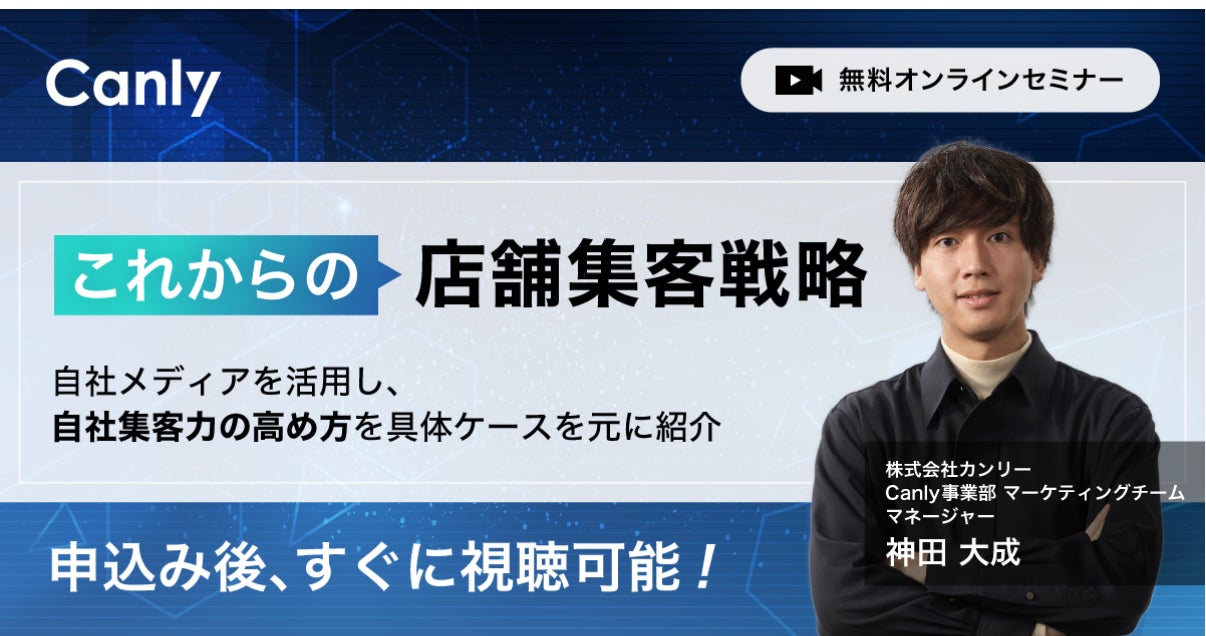 Googleビジネスプロフィール(旧・Googleマイビジネス)・HP・各SNSの一括管理サービス「Canly(カンリー)」の開発・提供を行う株式会社カンリー(所在地:東京都渋谷区、代表取締役:辰巳 衛,秋山 祐太朗)は、無料ウェビナー『これからの店舗集客戦略〜自社メディアを活用し、自社集客力の高め方を具体ケースを元に紹介〜』を公開いたしました。