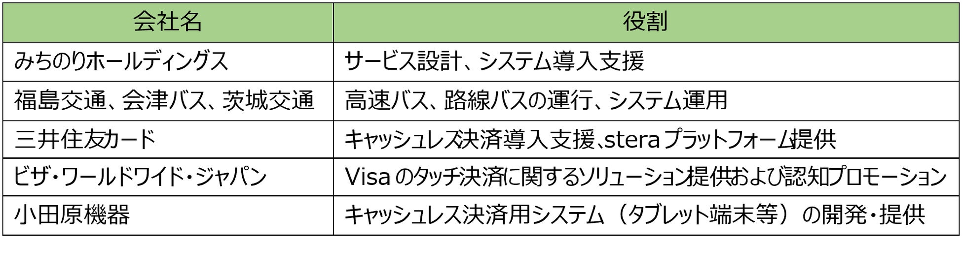 株式会社みちのりホールディングス(以下:みちのりHD)、福島交通株式会社(以下:福島交通)、会津乗合自動車株式会社(以下:会津バス)、茨城交通株式会社(以下:茨城交通)、三井住友カード株式会社(以下:三井住友カード)、ビザ・ワールドワイド・ジャパン株式会社(以下:Visa)、株式会社小田原機器(以下:小田原機器)は、2020年7月より導入を進めてきた高速バスにおけるキャッシュレス決済の対象路線を拡大します。車内におけるキャッシュレス決済手段は、Visaのタッチ決済およびQRコード決済で、カードやモバイル端末をリーダにかざしたり、画面をスキャンするだけで乗車ができるためお客様の利便性向上とともに、運転士と乗客の接触がないことで新型コロナウイルス感染予防対策としても有効です。