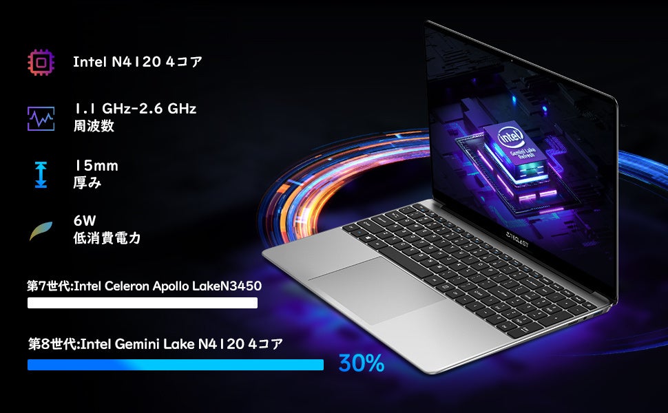 インテル Celeron N4120プロセッサーを搭載、4コア、4スレッド、および6Wの熱設計により、超低消費電力で優れたパフォーマンスを実現できます。内蔵Intel HD Graphic 600のGPUによりパワフルなグラフィックス処理機能を提供できます。ワード、エクセル、パワーポイントなどの文書作成、メールの送受信、ウェブサイトの閲覧、テレビ会議、プログラミングの学習など色々な作業はストレスなく使えます。