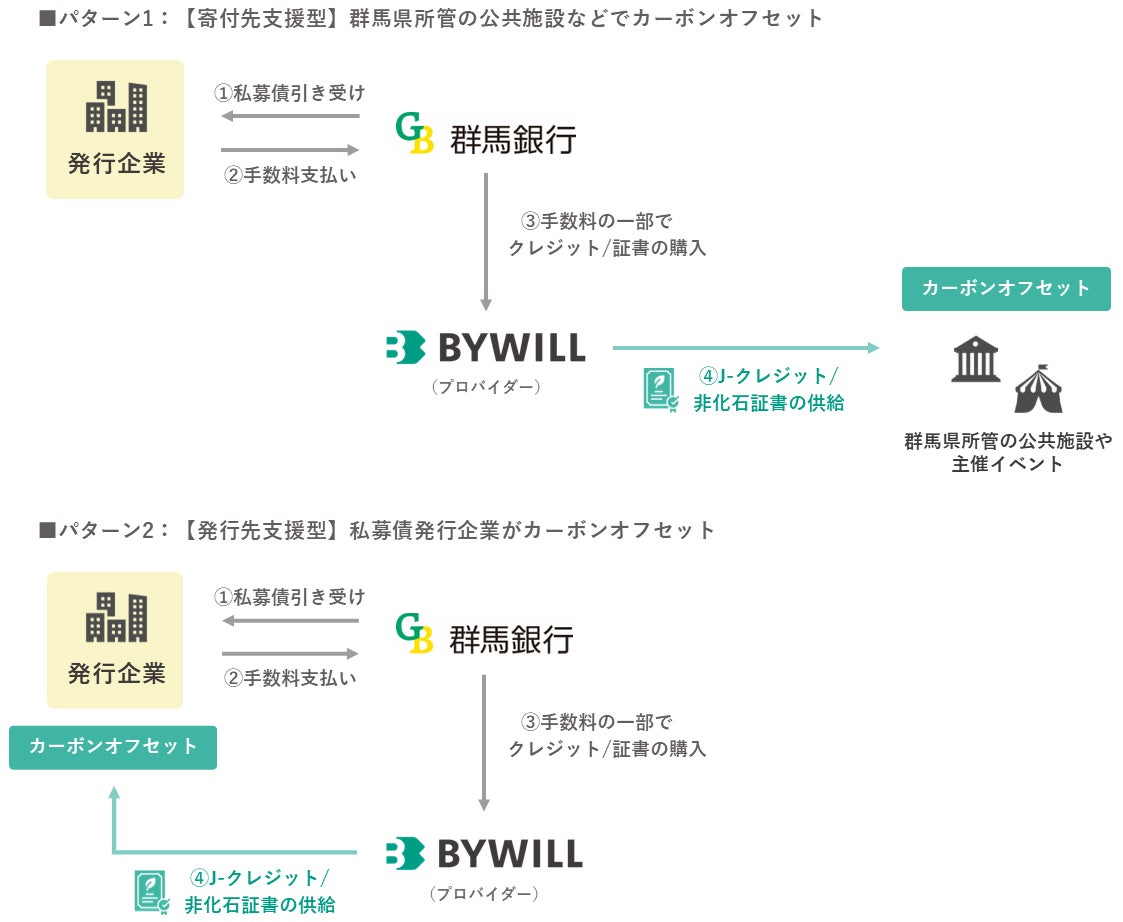 日本全国47都道府県のカーボンニュートラル実現を目指す株式会社バイウィル(本社:東京都中央区、代表取締役社長:下村 雄一郎、以下「バイウィル」)は、株式会社群馬銀行(本店:群馬県前橋市、代表取締役頭取:深井 彰彦、以下「群馬銀行」)が取り扱いを開始する「ぐんぎんSDGs私募債『カーボンオフセット型』」を、カーボンクレジット・プロバイダーとして支援することをお知らせします。