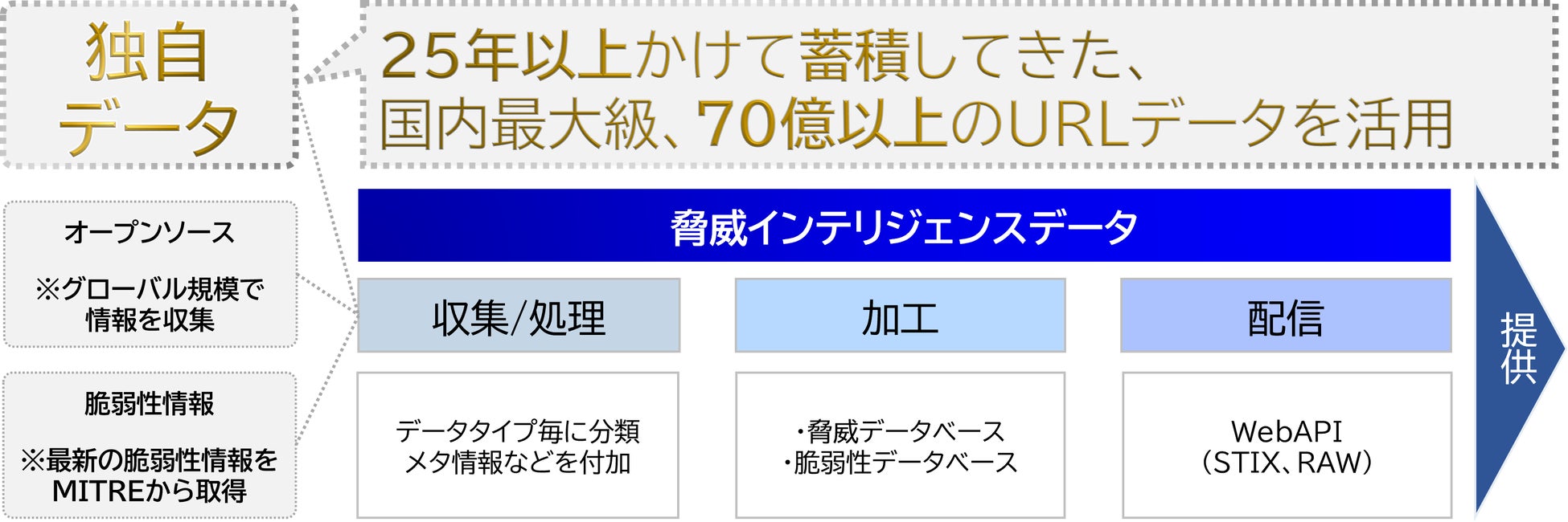 主なポイント | •70億以上のURLデータを含む独自データを活用して収集・処理した脅威インテリジェンスデータを提供 |