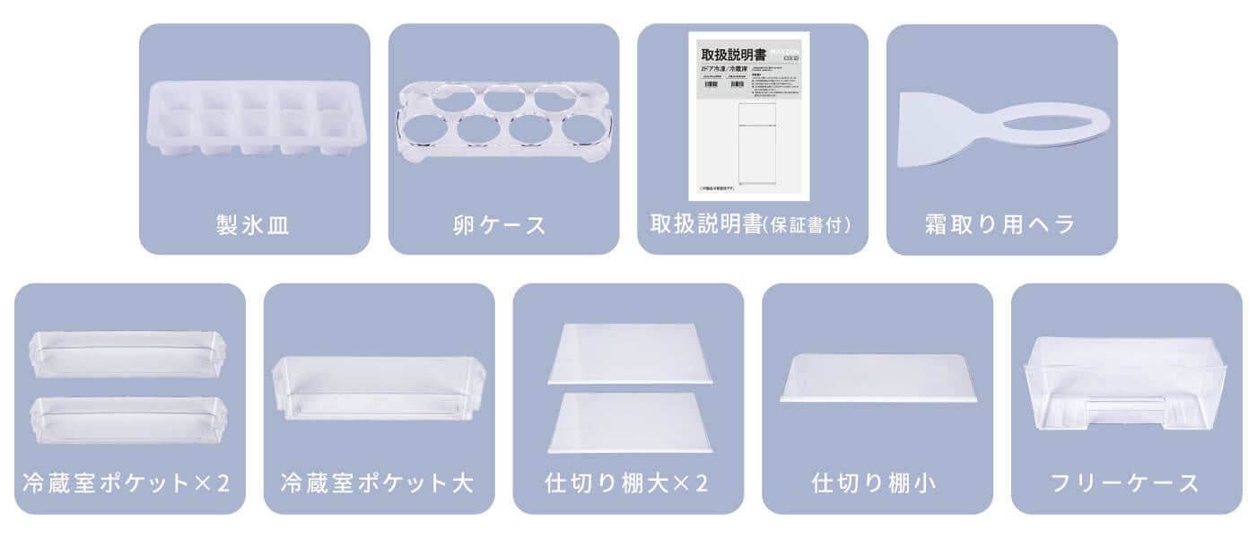 ドアポケットは深さがあることで食品が不安定になりにくく、必要な食材が整理しやすい設計です。また、一度に氷を10個作れる製氷皿が付属しているため、冷たいドリンクをいつでも楽しめます。