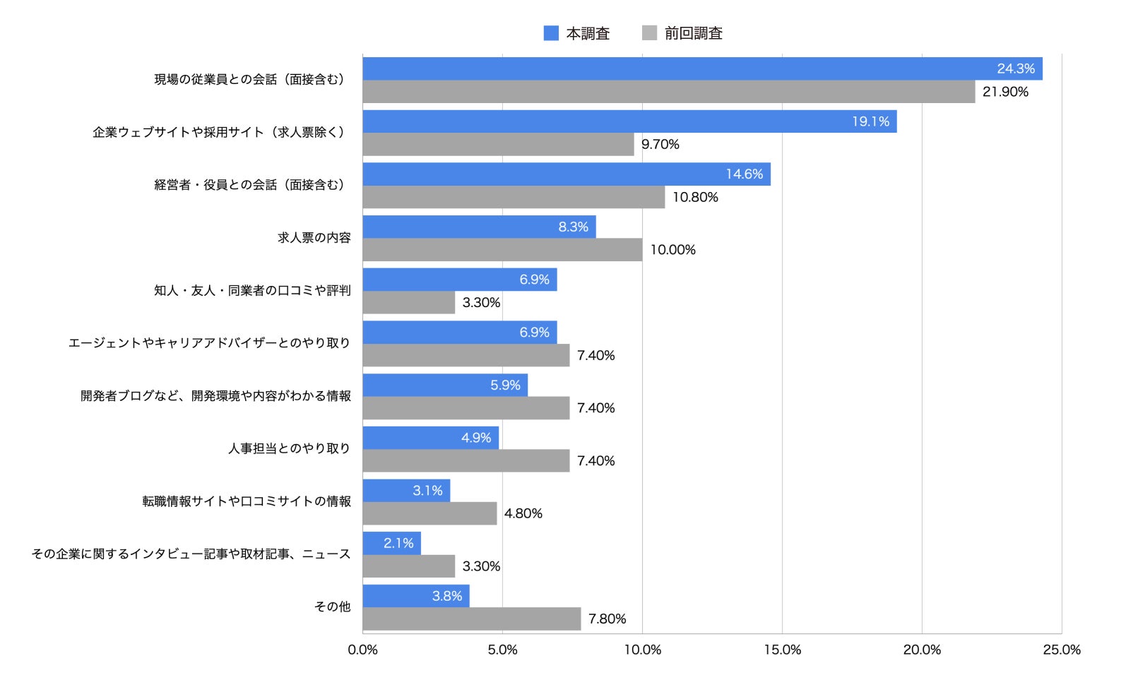 ネガティブな意見も含め、率直な意見を聞くことができる現場エンジニアとの会話が、最も参考になるという意見が目立ちました。前回調査との比較では、「企業ウェブサイトや採用サイト(求人票除く)」の回答が大きく増加(9.7%→19.1%)し、「人事担当とのやりとり」「エージェントやキャリアアドバイザーとのやり取り」の回答が減少していることから、候補者は一次情報を重視する傾向がより強まっていると考えられます。