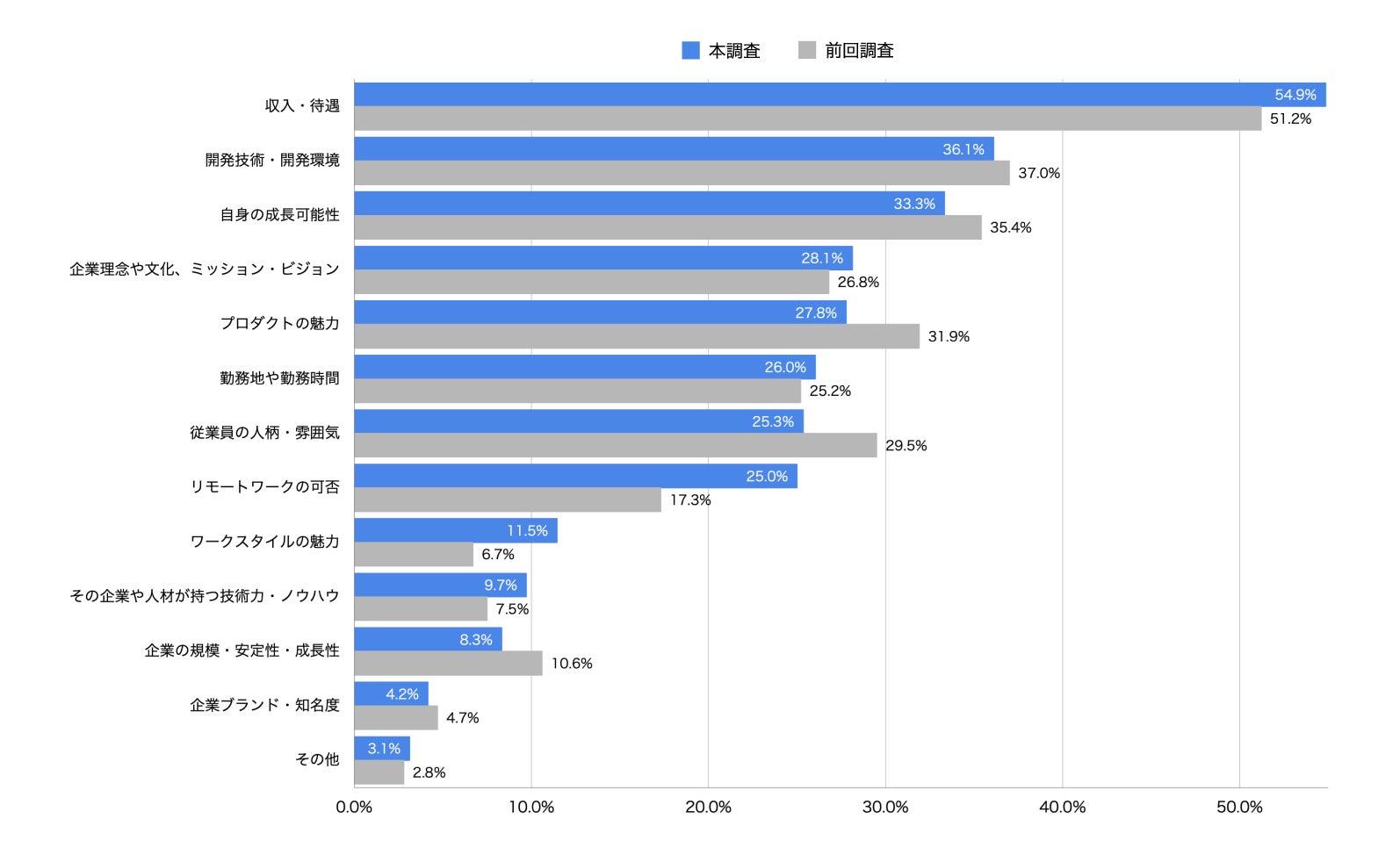前回調査に引き続き、転職時に重要視した観点は「収入・待遇」が最多(54.9%)、次いで「開発技術・開発環境」(36.1%)という結果でした。一方で、「リモートワークの可否」が17.3%→25.0%へ上昇、「ワークスタイルの魅力」も6.7%→11.5%へ上昇するなど、柔軟性・自律性の高い働き方を重視する傾向が強まっていることがわかりました。