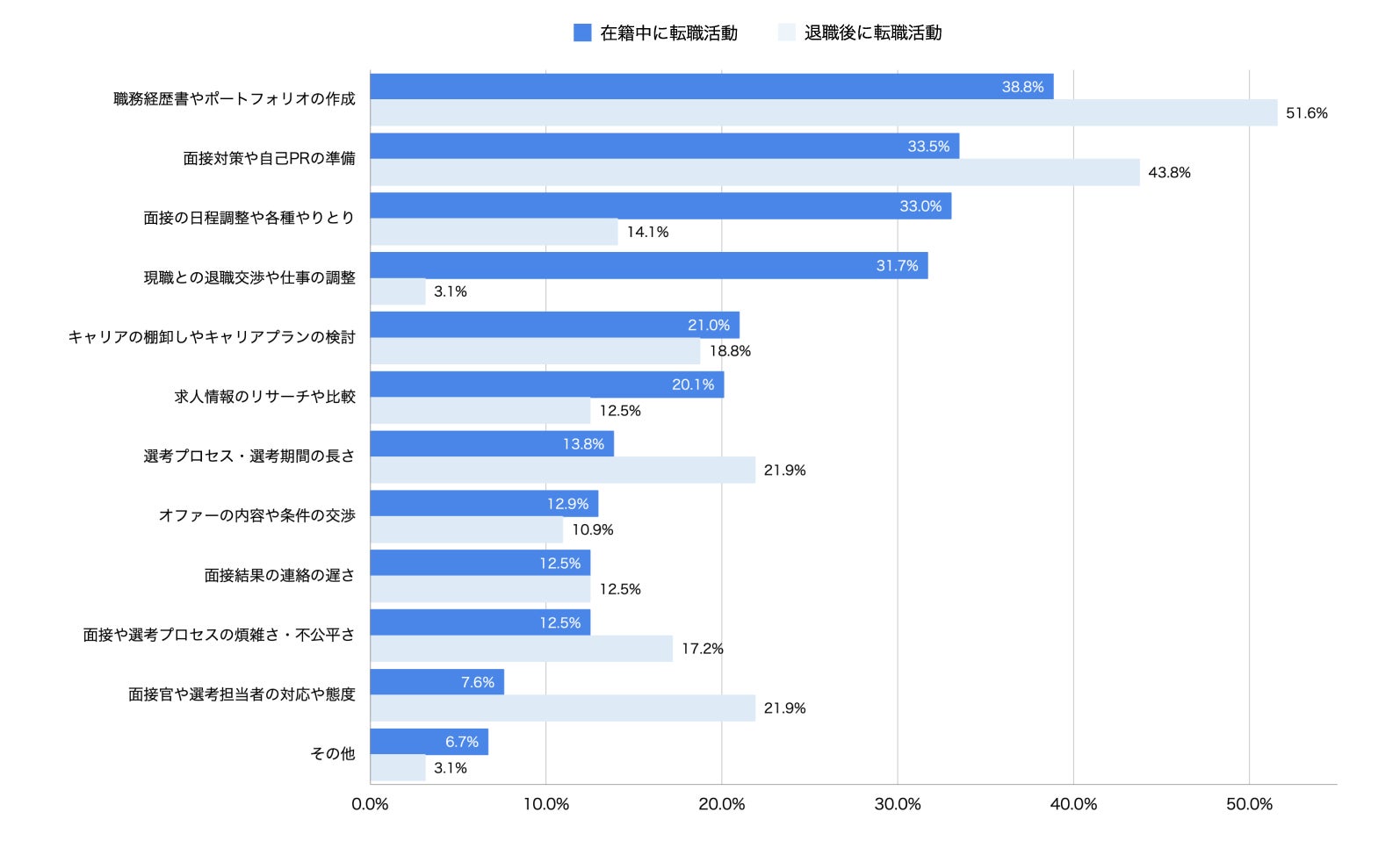 在籍中に転職活動をした方と、退職後に転職活動をした方を比較すると、前者は「現職との退職交渉や仕事の調整」や「面接の日程調整や各種のやりとり」を挙げた人が比較的多く(各30%以上)、後者は「選考プロセスや選考期間の長さ」および「面接官や選考担当者の対応や態度」を挙げた人が比較的多い(各20%以上)という結果となりました。