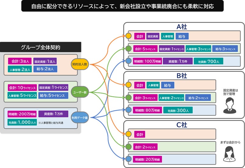 『奉行V ERPクラウド Group Management Model』では、利用ライセンス数やデータ容量などのリソースをグループ全体で契約し、各社に自由に配分できるライセンス体系を提供します。