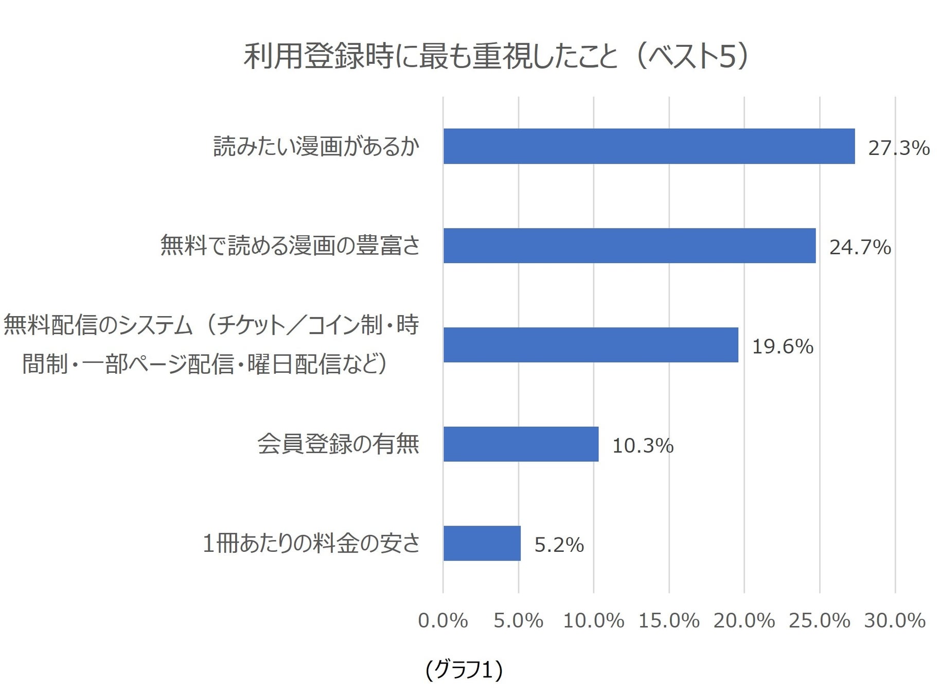 利用登録時に最も重視したことは「読みたい漫画があるか」が27.3%と最も多く、次いで「無料で読める漫画の豊富さ」「無料配信のシステム」と続きました(グラフ1)。