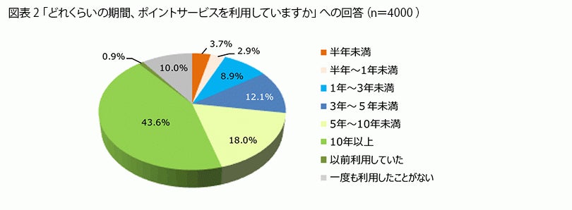 利用期間では(図表2)「10年以上」が43.6%と最多、次いで「5年~10年未満」18.0%と、6割以上の人が5年以上と回答。「半年未満」3.7%、「半年~1年未満」2.9%と利用経験が浅い人は計6.6%にとどまりました。もはや、“買い物の際にポイントサービスを利用するのはデフォルト”とも言えそうです。