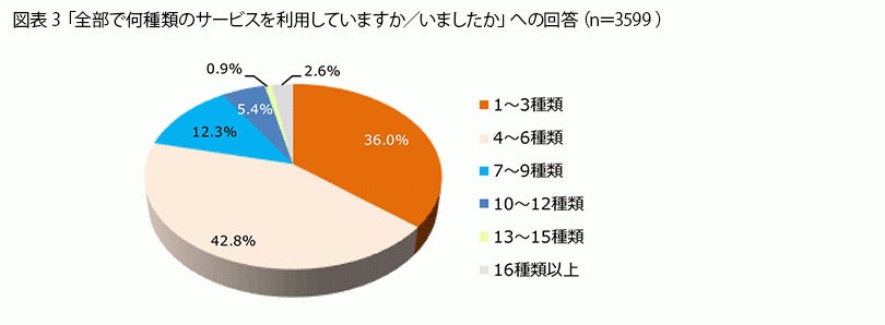 次は過去を含め利用経験がある人に、使っている/使っていたサービスの数をたずねてみました(図表3)。42.8%と最も多かったのが「4~6種類」、これに「1~3種類」が36.0%と6.8ポイント差で続きました。対して「7~9種類」12.3%、「10~12種類」5.4%、「13種類以上」計3.5%と、7種類以上は全体の2割強にとどまる結果に。“何でも”というより、“厳選・集約して、効率よく”ポイントを集めている人が多いようです。
