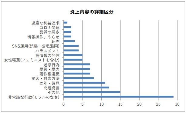 投稿内容に「炎上」というキーワードを含む2,877件の投稿から86件の炎上事案を抽出し、炎上の原因となった問題行動の主体、問題行動の内容、炎上を起こした企業の業種などの切り口から傾向を分析しました。