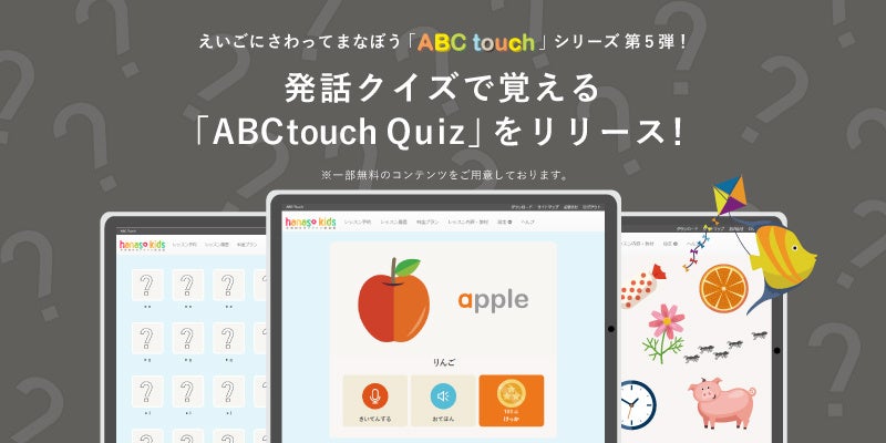 株式会社アンフープ(所在地:静岡県富士市、代表取締役社長:重森 渉)がサイト運営する、無料通話ソフトSkype(スカイプ)またはZoom(ズーム)を利用した子ども向けオンライン英会話「hanaso kids」は、2022年9月1日(木)より、オリジナル英語学習アプリ「ABC touch」シリーズ第5弾 “発話クイズで覚える“「ABC touch Quiz」をリリースいたします。